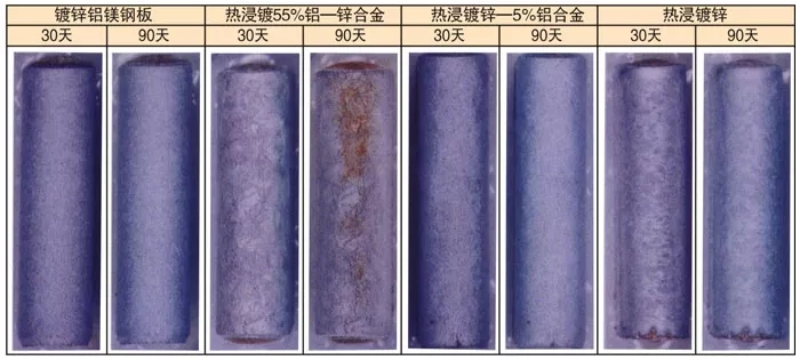約七年暴露結果表明,鍍鋅鋁鎂鋼板比熱浸鍍鋅鋼板的耐蝕性約高4倍。隨著時間的推移,非鎂鋁鋅板材腐蝕速度隨著時間推移腐蝕越來越快,單鎂鋁鋅板材并不會發生此種狀況。